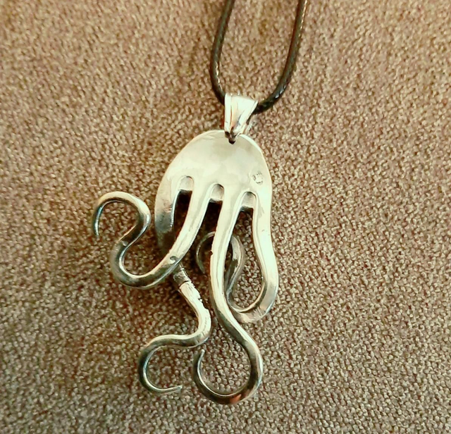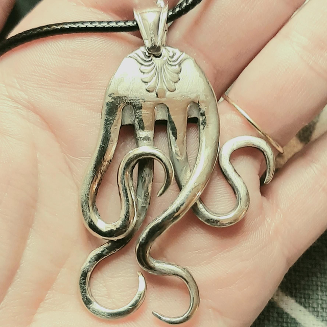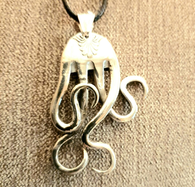 Pendentif Médusa, avec cordon. Upcycling d'une fourchette en argent massif.