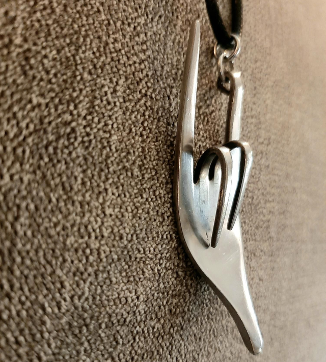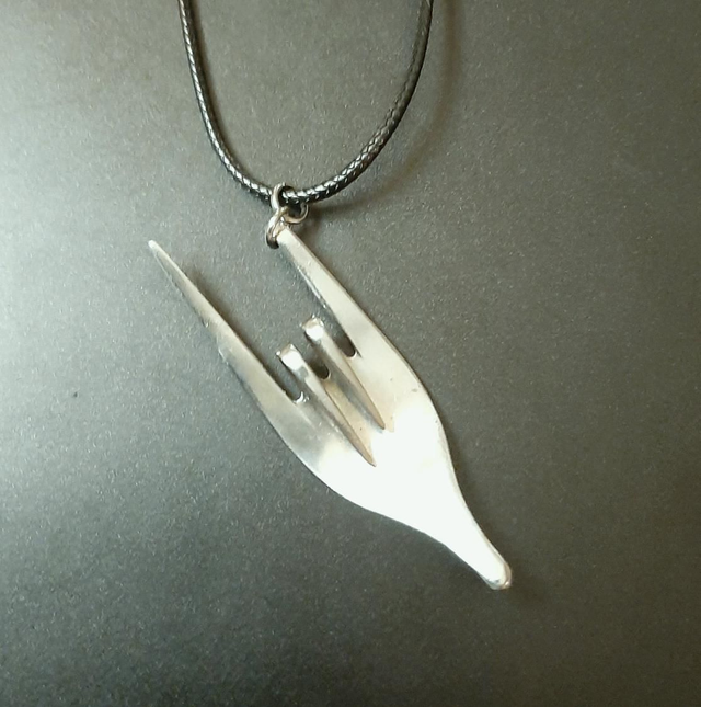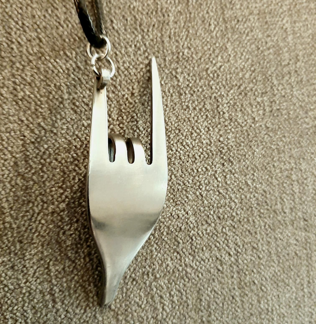 Pendentif avec cordon, issu d'une petite fourchette en acier inoxydable.