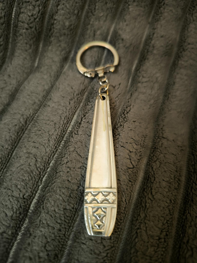 Porte-clé en métal argenté, upcycling d'une petite cuillère.